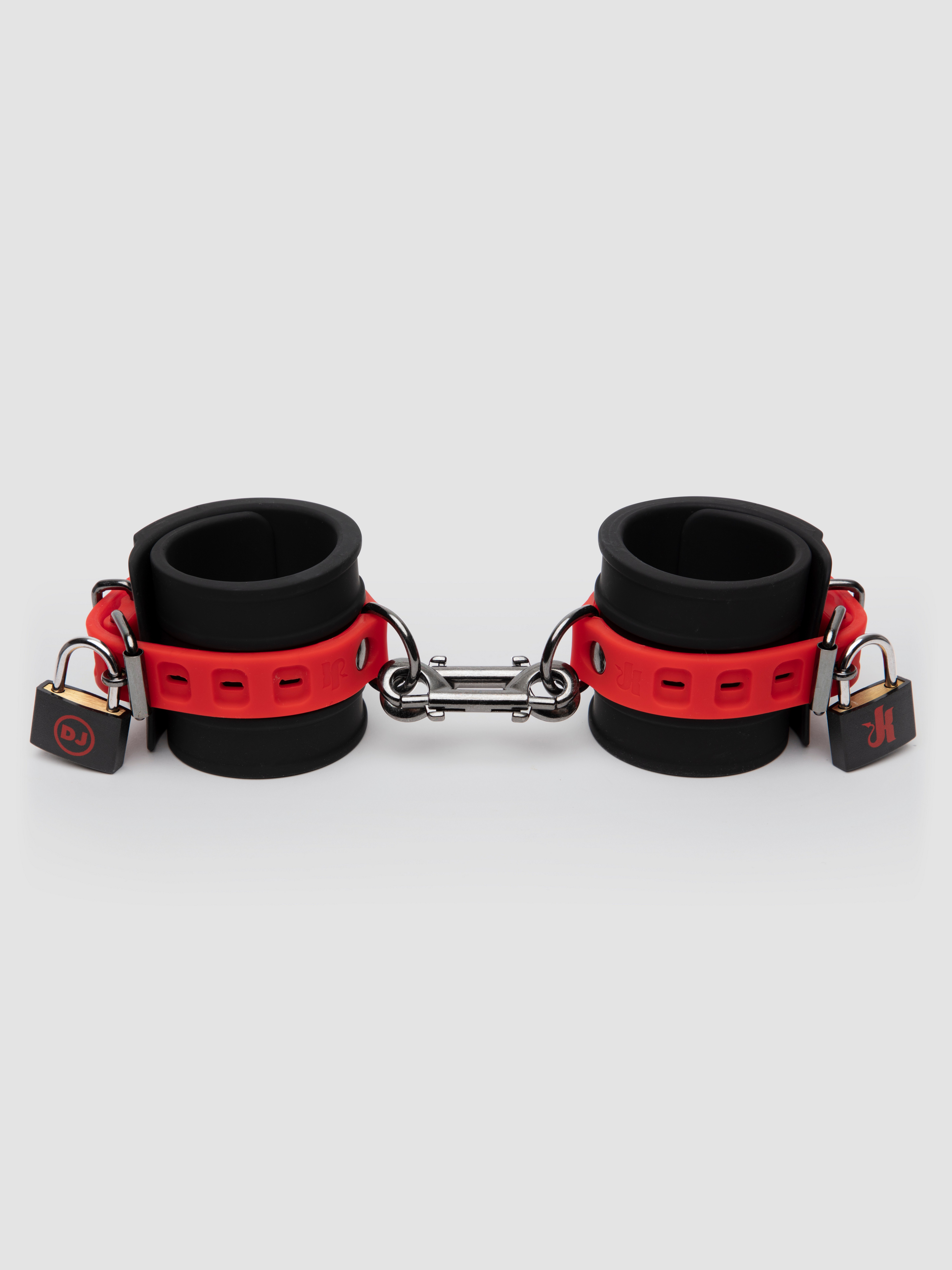 Buckle up for a kinky time. Smooth silicone and nickel-free metal come together in this pair of strong yet comfy-to-wear hand cuffs. Use the built-in D-rings to attach your sub's cuffs to all kinds of toys, like spreaders, hog ties and more.