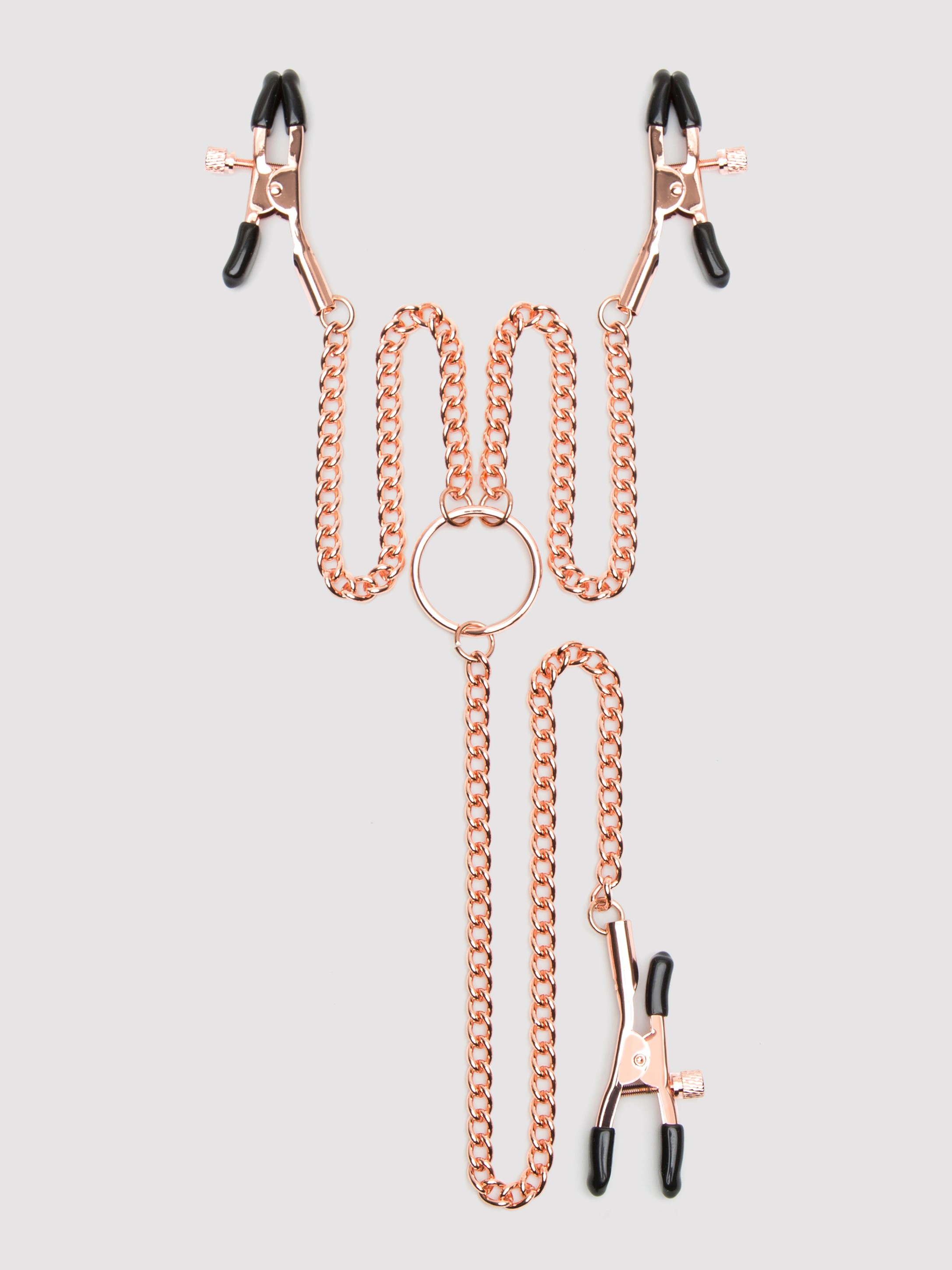 - Rose gold colored nipple and clit clamp set with chain and O-ring