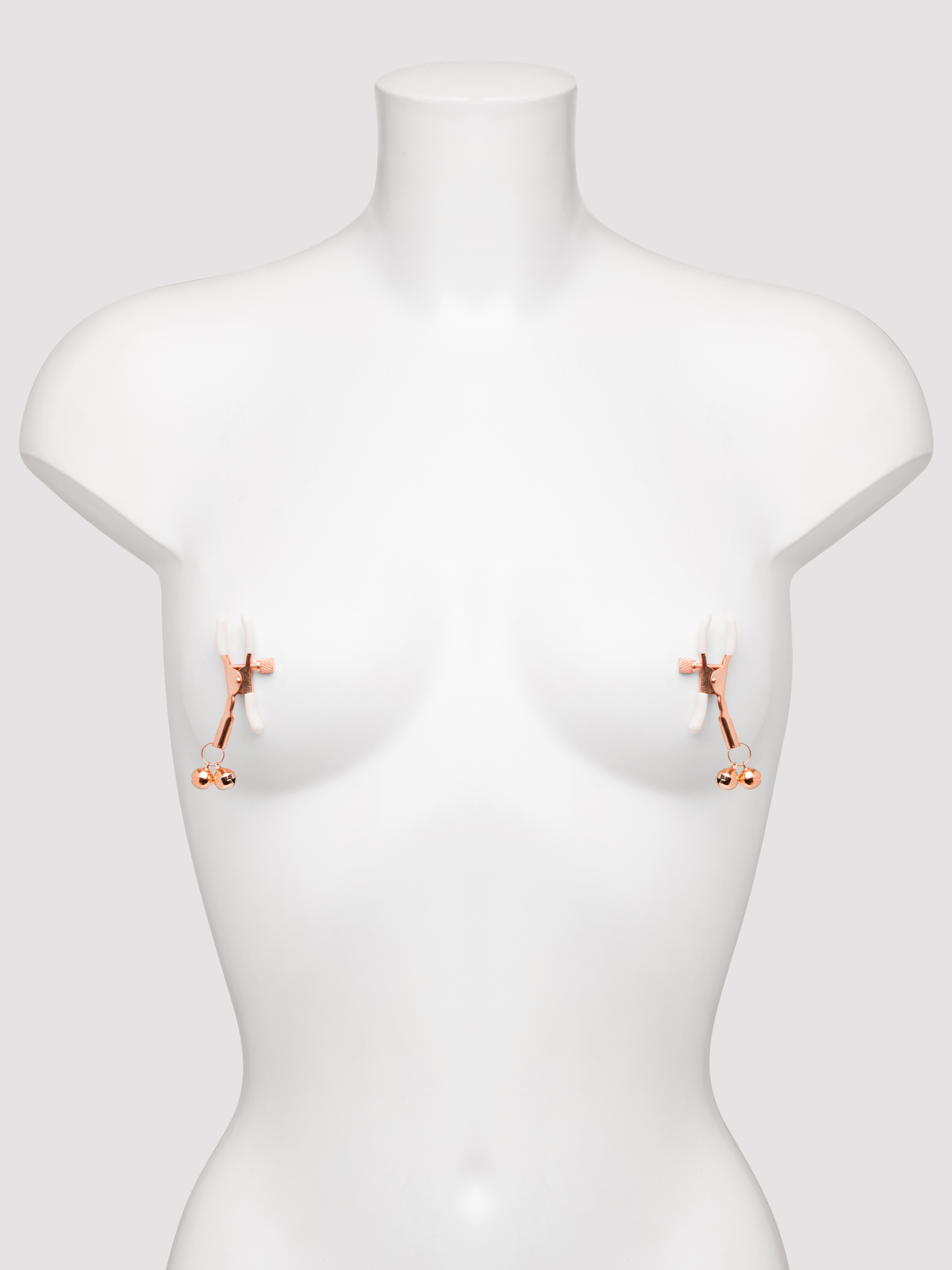 - Peach-colored nipple clamps with nickel-free, rose-gold bells accents for BDSM-style play