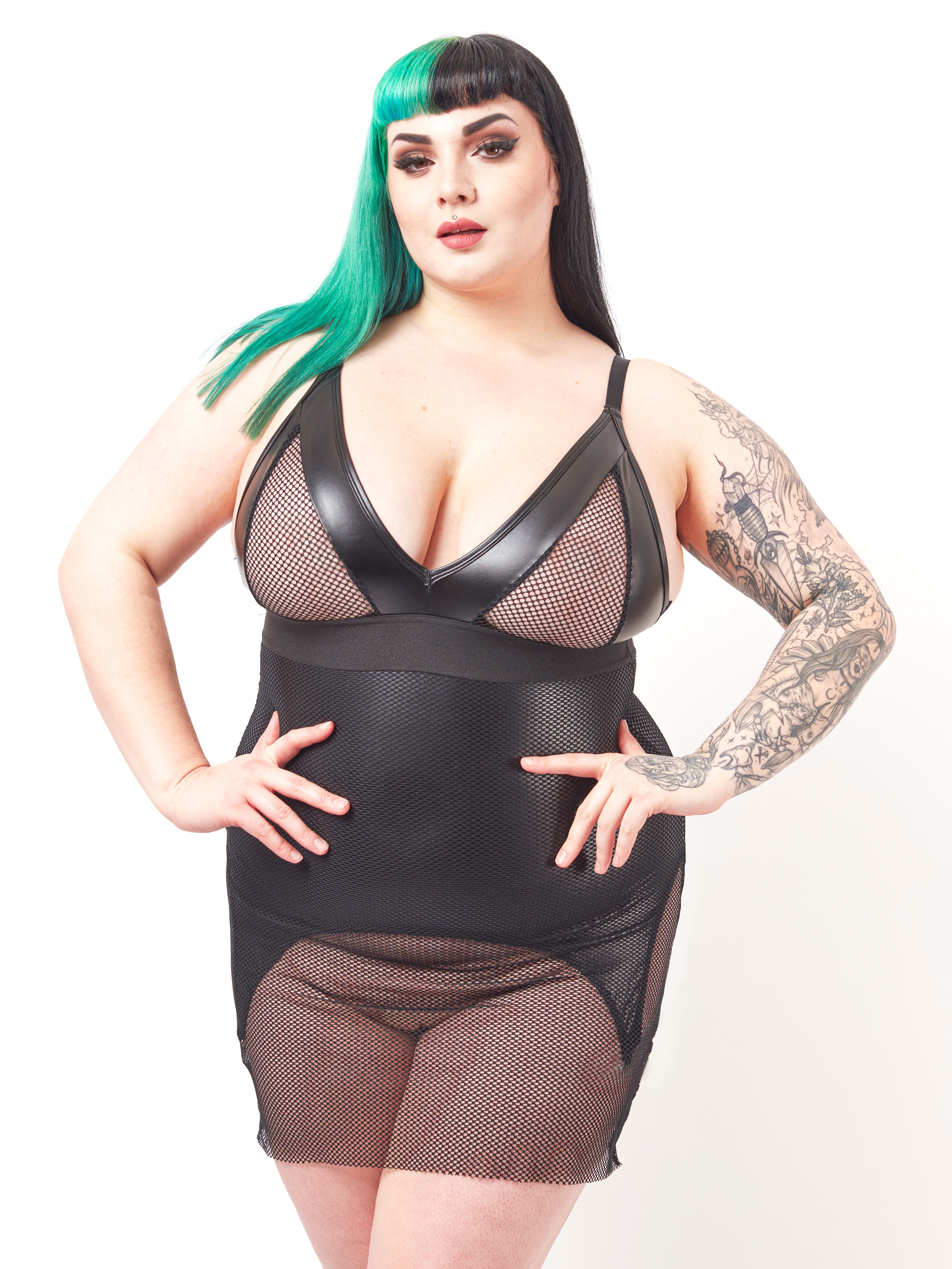 - Super-flattering wet look and fishnet garter dress for a fetish-inspired look