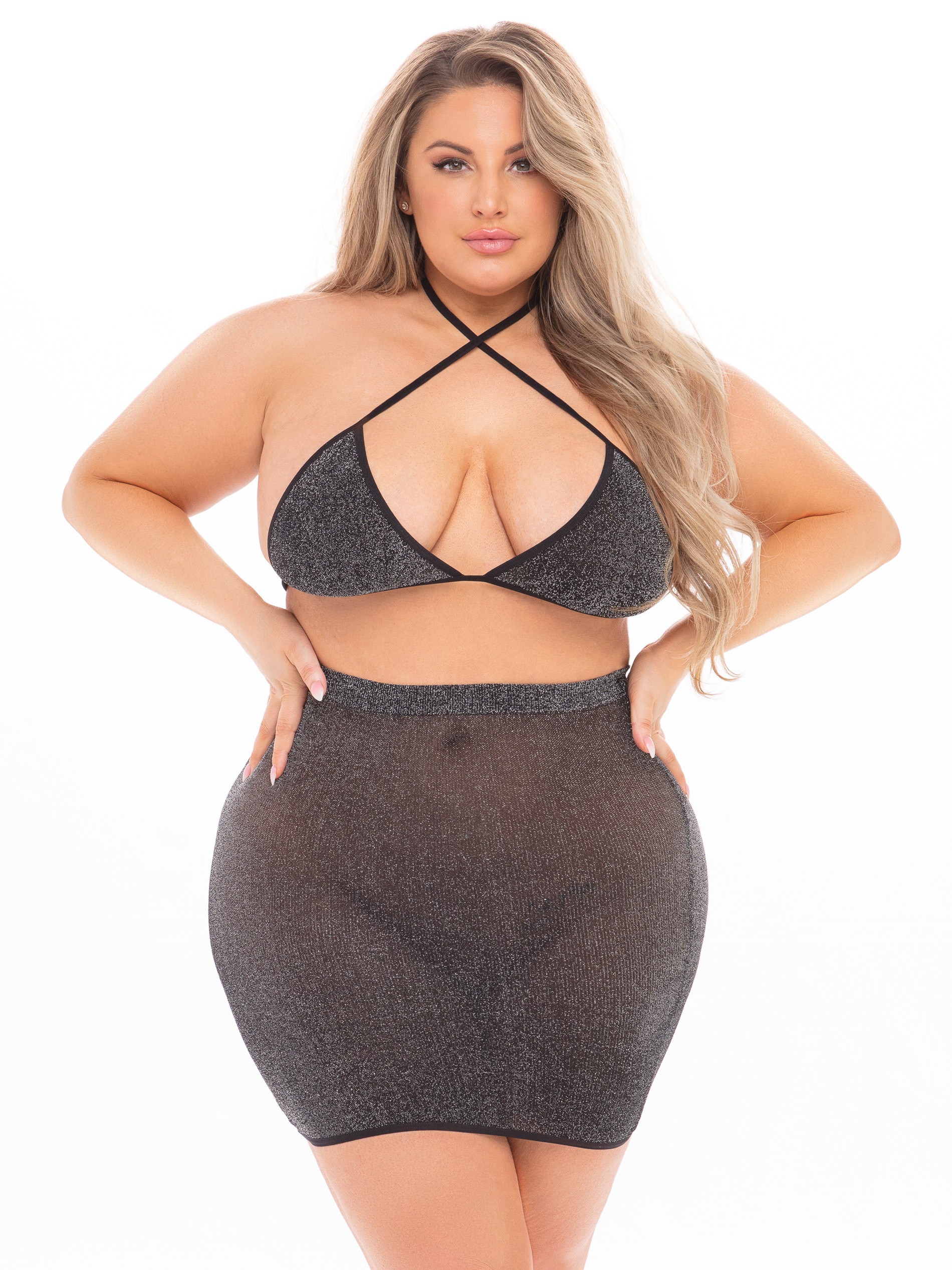 We'll see you at the glitter end in this stunning bra and skirt set. With a cleavage-enhancing halterneck bra top and a matching sheer mini skirt, this daring duo is perfect for the boudoir or the club. Pair with thigh-high boots to complete the fantasy.