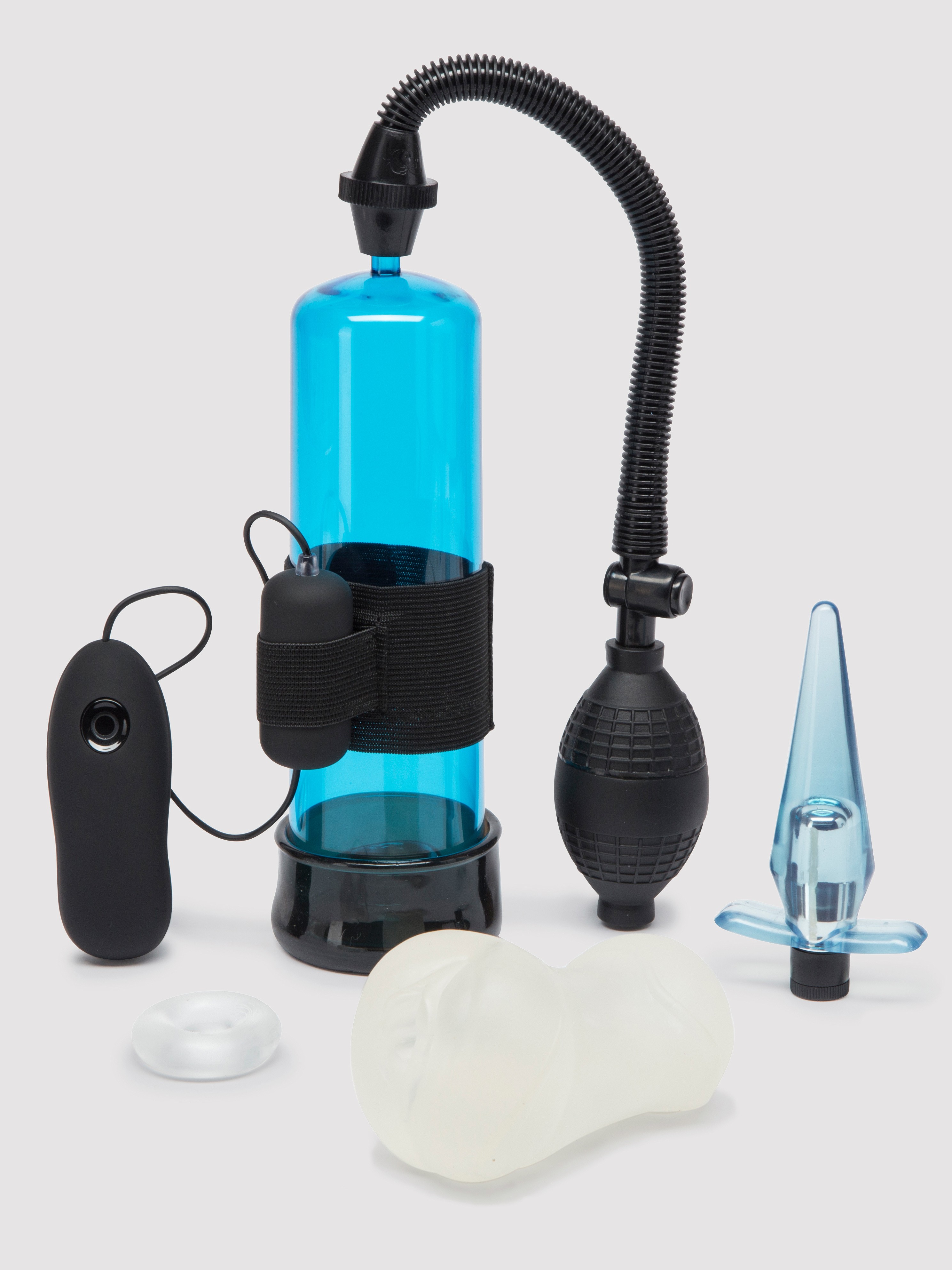 - Male sex toy kit featuring vibrating penis pump, butt plug, cock ring and stroker