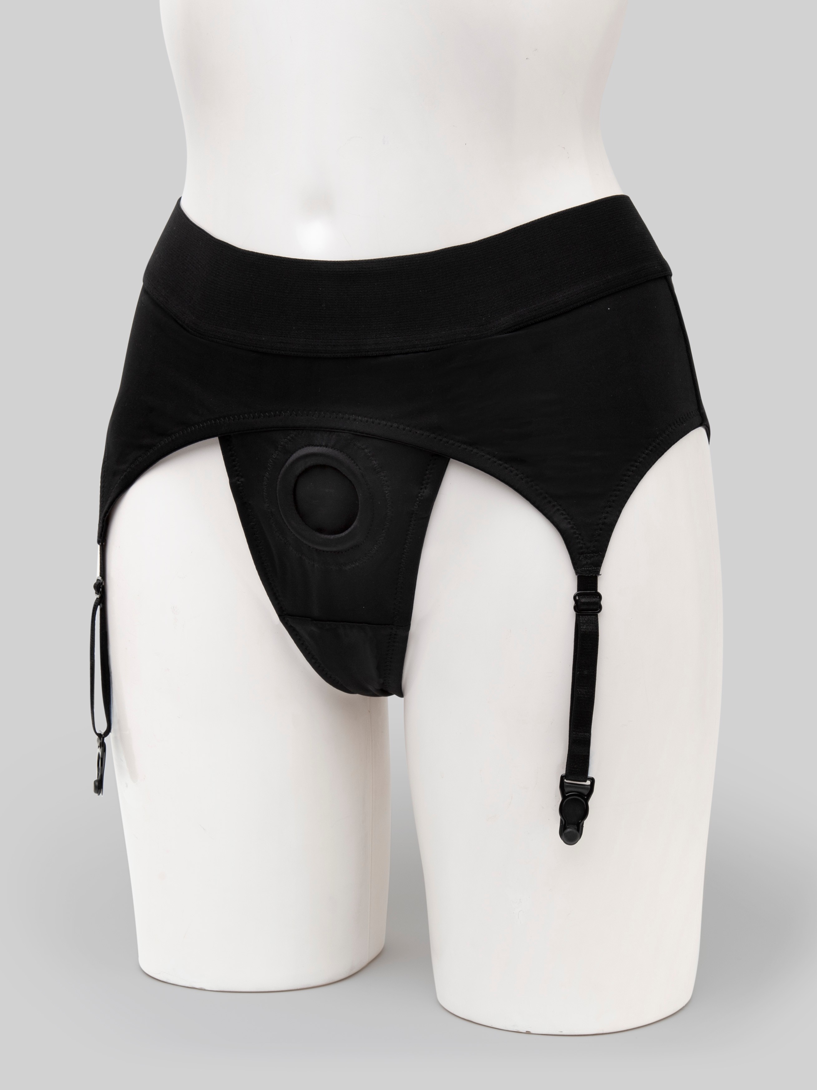 For superior comfort and versatility, this strap-on garter thong is the superior way to play. Created with an extra-wide waistband and a reinforced stretchy O-ring to support most attachments, it also boasts a double panel interior for easy access.