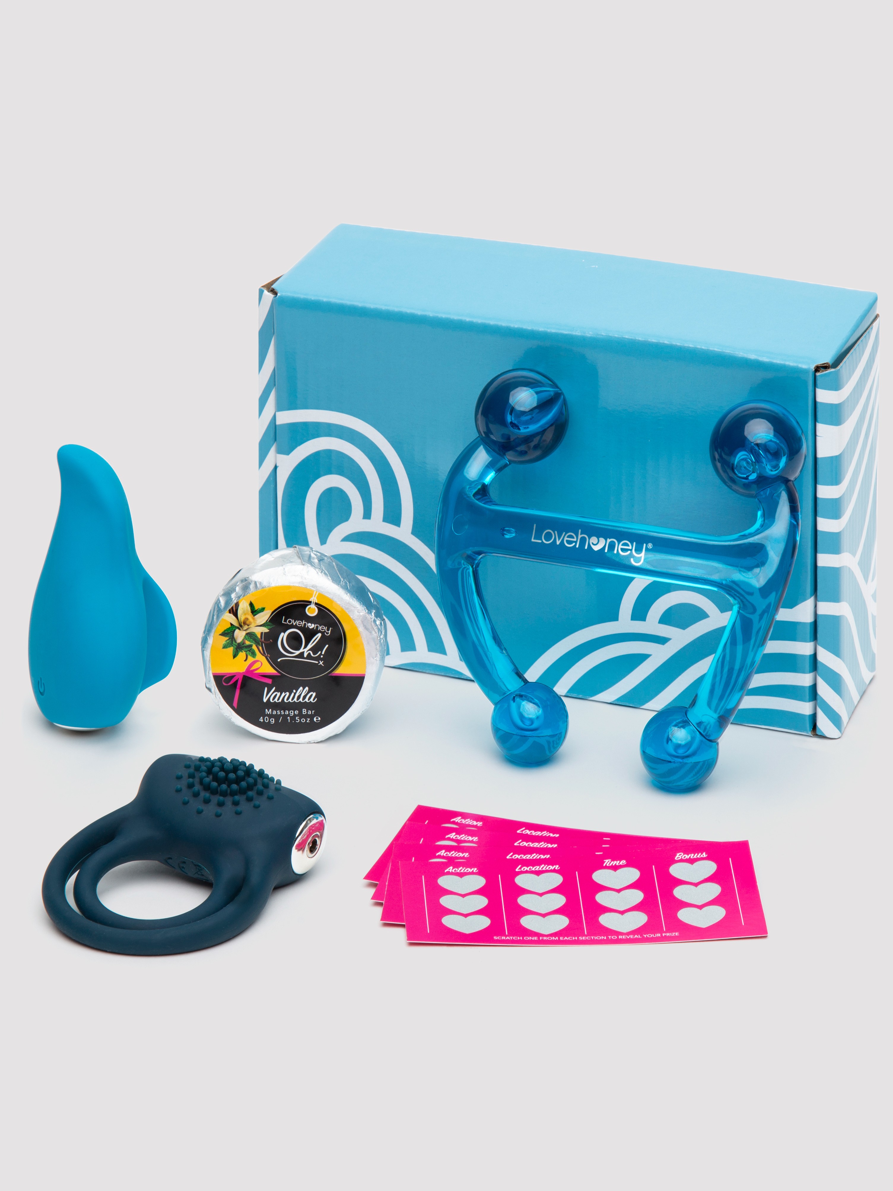 Unwrap this bountiful bundle and give the gift of erotic enticement to your lover. Featuring a finger vibrator worth $49.99 all on its own, this 5-piece kit also offers a vibrating love ring, sexy scratch cards and set of massage essentials to share.
