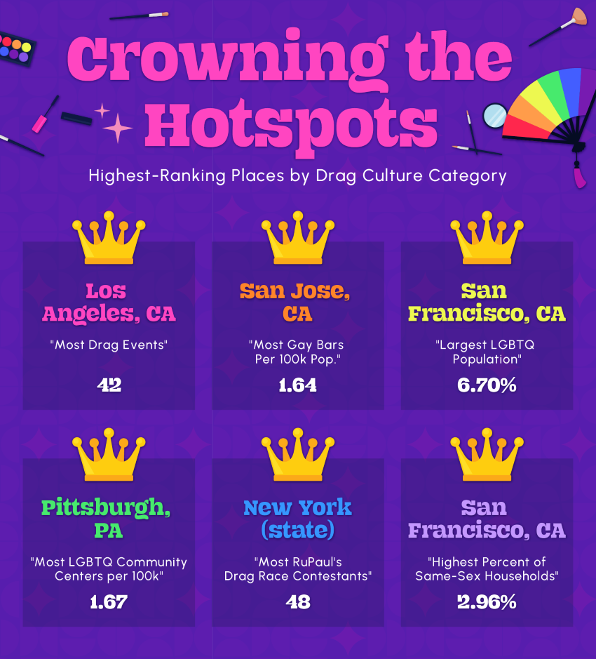To determine the best U.S. cities for drag culture, we compared the 50 most populous U.S. cities across a set of indicators tied to drag visibility, LGBTQ+ nightlife concentration, community footprint and infrastructure, performance ecosystem strength, and local policy context.